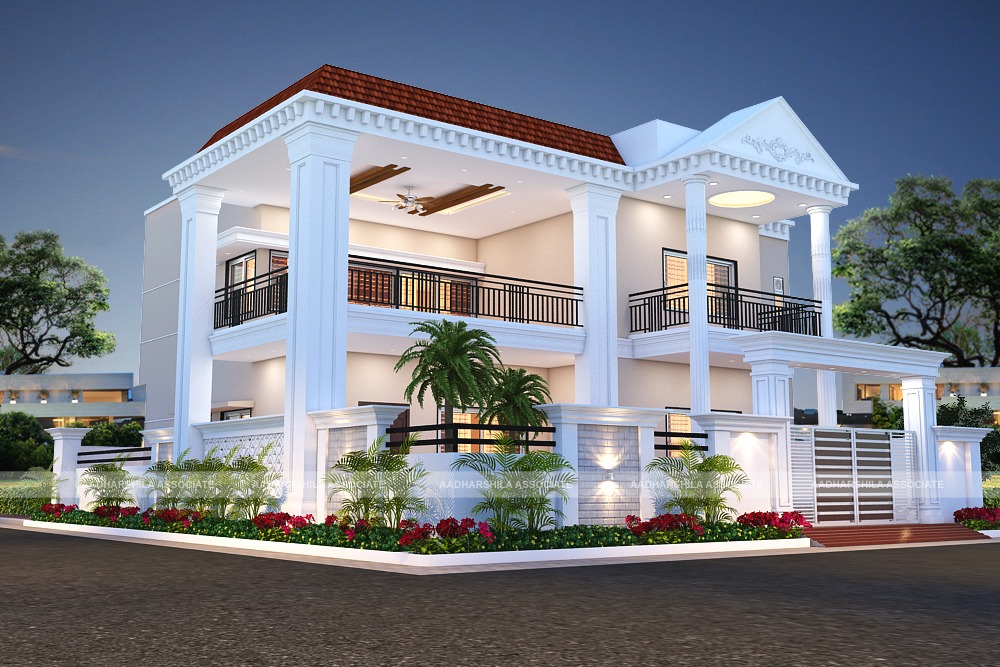 Outdoor view of a villa ! By day, the surrounding landscape and the vistas beyond become part of the resort-like experience as rows of concrete, instead of hardscaping, mark the covering of aesthetic view. Internal spaces between brick wall are oriented towards satiating views. At night, villa becomes a world unto itself, it’s surroundings illuminated by gentle garden lightening.